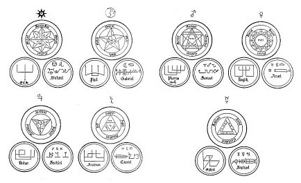 The Seven Seals of the Seven Archangels from a 16th century treatise, The Complete Book of Magic Science; the seals of the Seven Olympian spirits are also shown above.